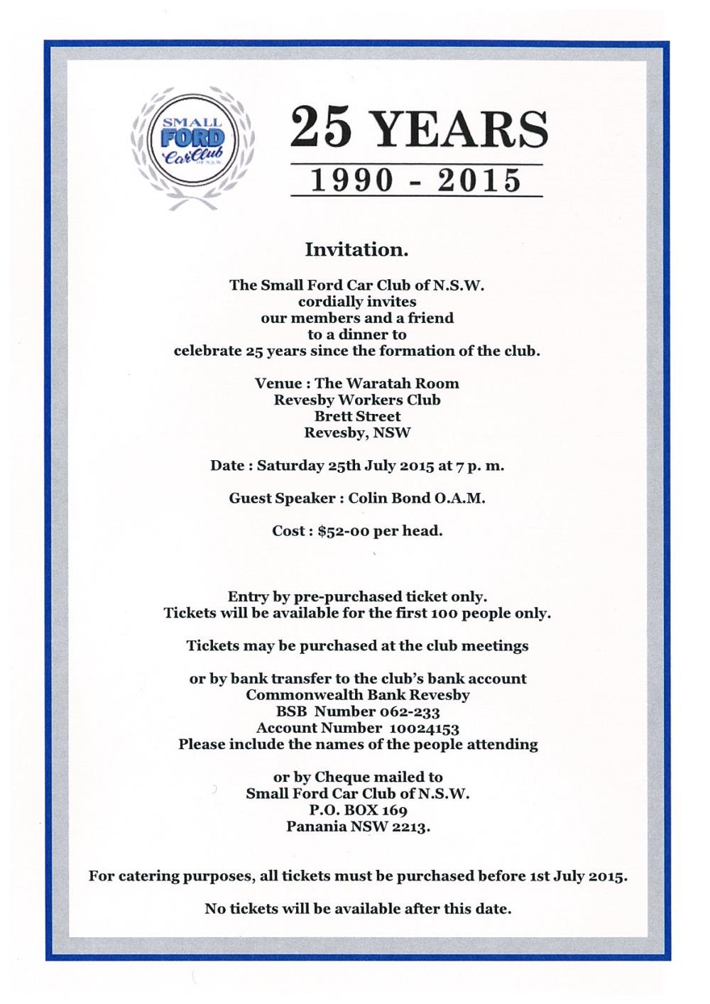 Hi All Now just one week to go to get your tickets to this significant car club event. We would very pleased to see as many of you as possible come along to enjoy what promises to be a wonderful night. The club meeting next week [Wednesday 1st July] is your last chance to get a ticket. After that if we have any left they will made available to former members.  Then we have to notify the Revesby Workers Club of the numbers.