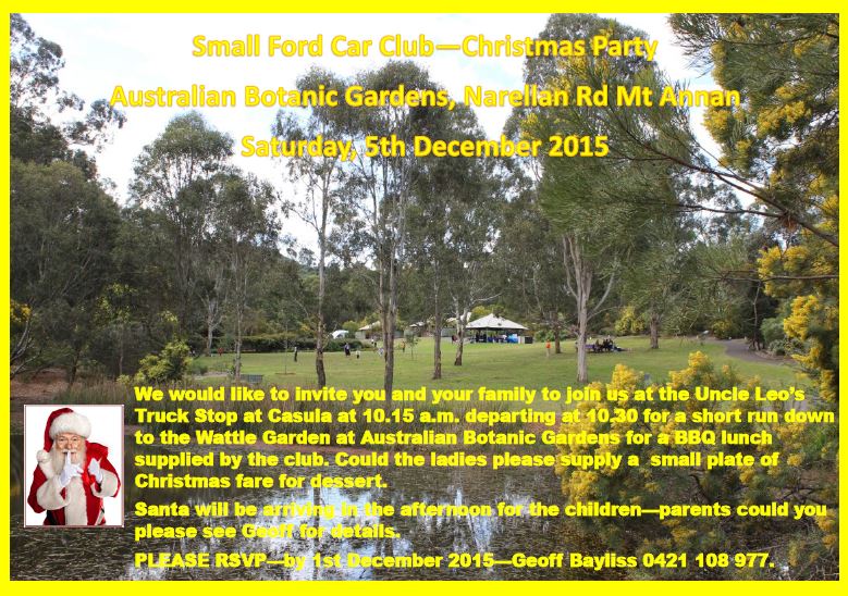 This year's Christmas Party will be held once again in the Wattle Garden at The Australian Botanic Garden, Narellan Road, Mt Annan on Saturday, 5th DECEMBER. [starting at around 11.00am] Please come along and join the fun. We will provide a free Bar-B-Cue lunch with soft drinks, coffee and tea. [ladies can you please bring some salad or dessert to help with the catering], BYOG. Parents of young children are asked to provide a small gift wrapped present which will be given to Santa Claus to give to the kiddies when he arrives around 2 o'clock. For those that would like to enjoy a short cruise to the gardens, meet at Uncle Leo's Caltex Casula at 10.00am departing at 10.15am.  |