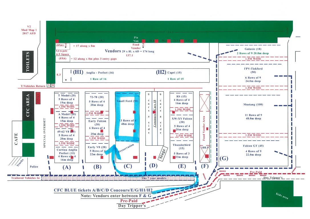 Below is the mud map showing where our display area is on the day. It is the same spot as last year but we will be next to both the Concours' and Preservation Class's of cars.